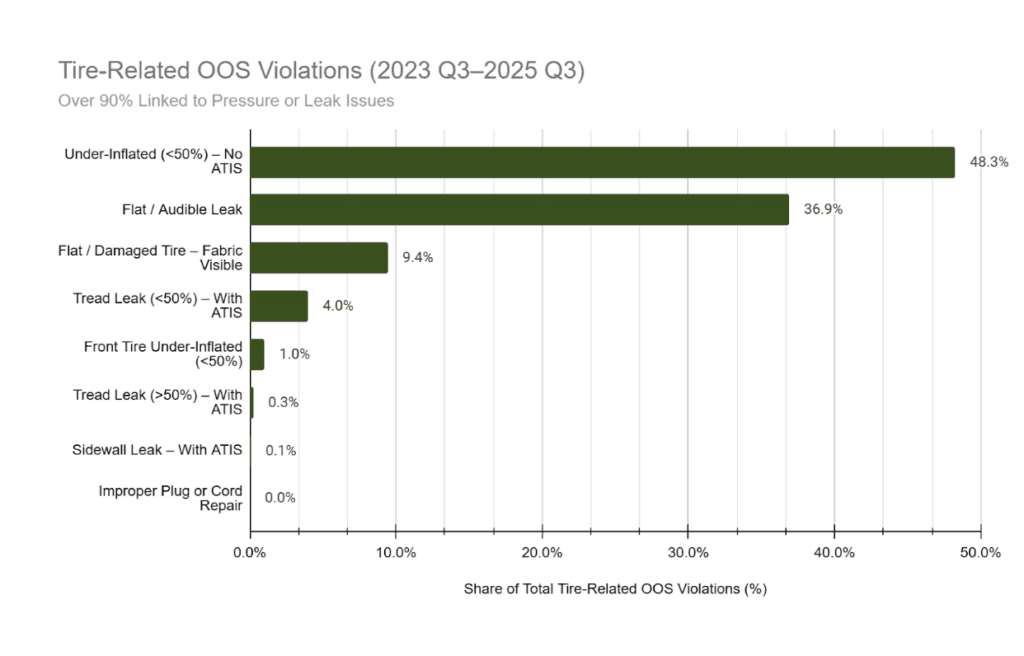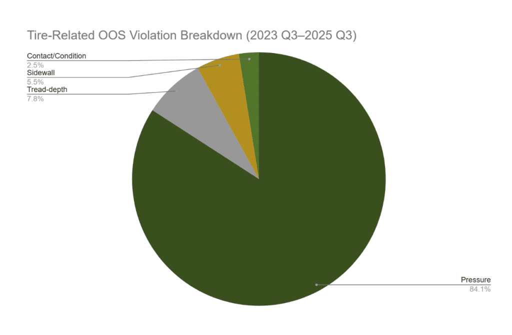In other words: Tires don’t get flagged often, but when they do, the truck stops moving. Inflation is the top compliance and uptime risk.
