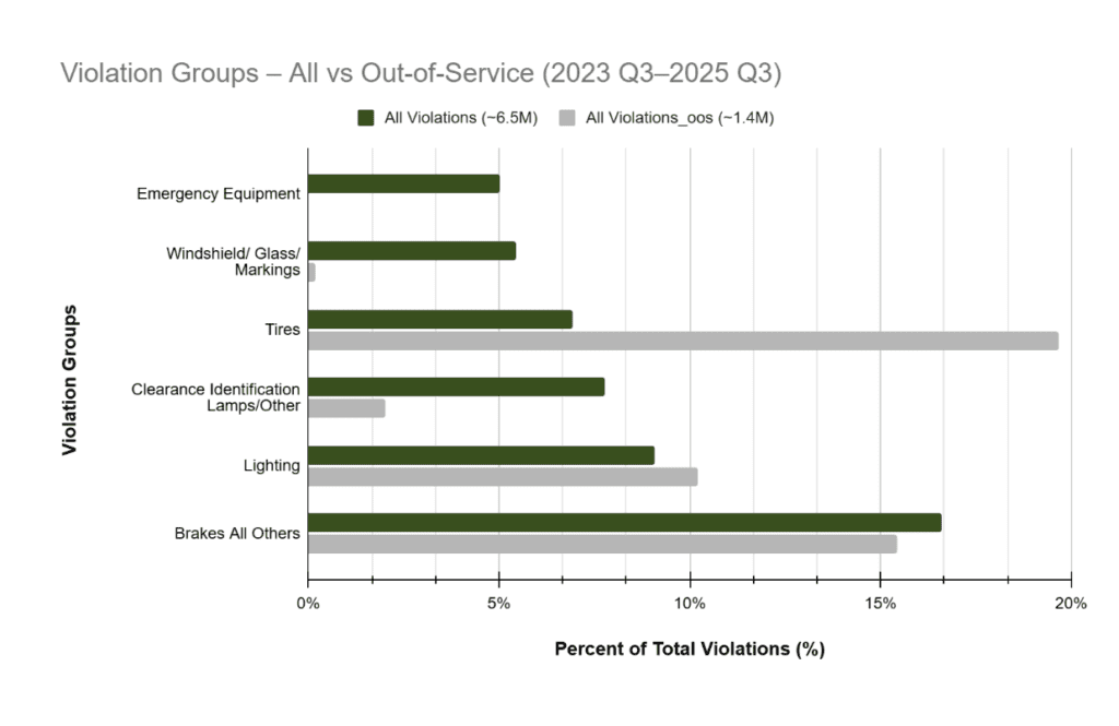 From Q3 2023 to Q3 2025, inspectors logged about 6.5 million violations across commercial motor carrier fleets (trucking and motorcoach vehicles). Of these, tire-related issues ranked 4th overall, roughly 7% of all cases.