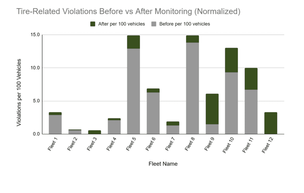 - An evaluation of tire-related violations across 12 fleets shows a marked improvement after implementing Revvo’s monitoring system. Normalized violation rates (per 100 vehicles) drop sharply across nearly every fleet, even though the post-monitoring window covers only four months.